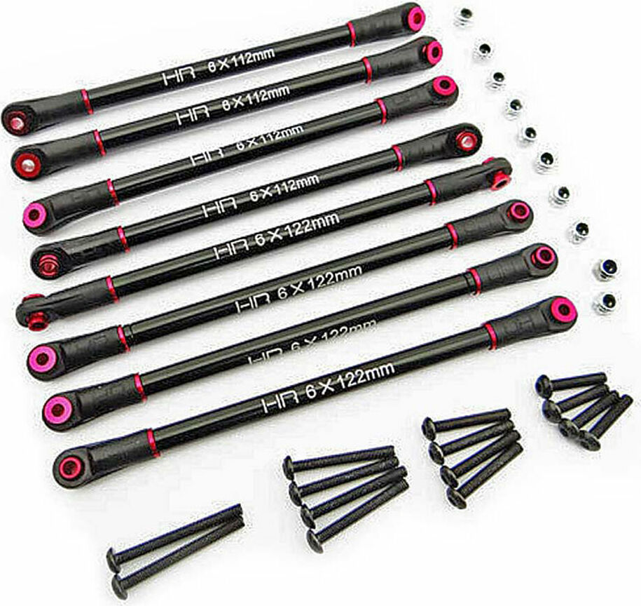 Hot Racing optional upgrade aluminum 4-link set for 12" (305mm) wheelbase Axial SCX10 vehicles. Add durability to your SCX10 by upgrading your stock plastic links with the Hot Racing aluminum link kit. The links eliminates axle wrap and unwanted axle steer, especially in high power applications. Vehicle compatibility is listed in the comments. If not listed, check the wheelbase tech specs of your Axial vehicle to determine compatibility. Installation also requires front and rear 4-link axle trusses.